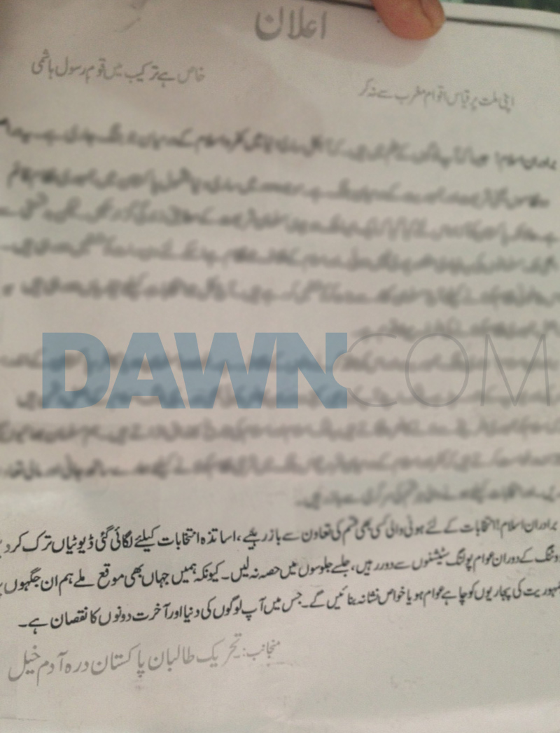 The pamphlet issued by the Darra Adma Khel chapter of the TTP also warned the citizens at large from participation in the electoral process.
