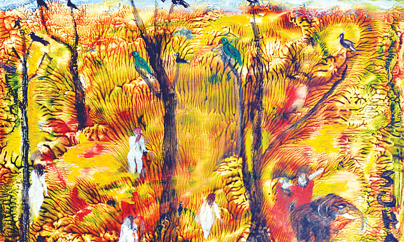 This is felt more strongly when the viewer gets to see in Tasadduq Sohail’s paintings how the fertile imagination of an artist can make assorted ideas gel like a well-connected story. In one artwork there are three layers of subjects: blue (birds), yellow (trees and ambience) and blue (the creatures in water). These layers are not apparent. They form a unity that becomes clear in a dream-like situation. Once the eyes are open, the clarity dissolves into a wish.