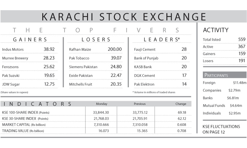 KARACHI: Stocks moved forward on Monday with the KSE-100 index adding 69.18 points, or 0.20 per cent, to settle at 33,844.30.