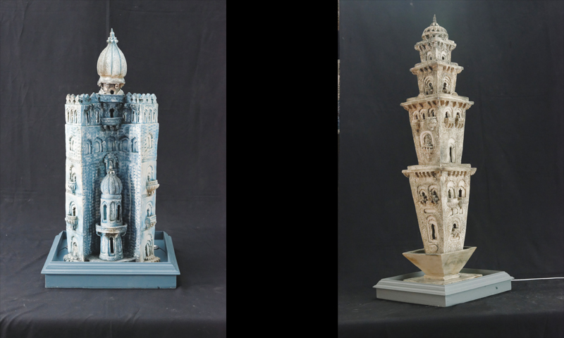 On the artistic side, the ceramist has not tried to reproduce the key models of the architectural heritage but has unleashed his imagination to capture the conceptual and thematic value in his art. The individual and emotional affiliation of the artist with this heritage has caused an artistic distortion in many of his pieces. The elongated shapes, intricate decorative patterns and the traditional elements of canopies or domes formulate an expression that can compel a viewer to touch and feel these pieces. “I just want to enter this door and walk through the corridors of these small buildings,” a visitor expressed her feelings irresistibly.