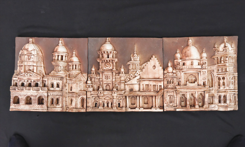 In the recent exhibition ‘The Past Lives On’ at the Collectors Galleria Lahore; Hussain has given vent to his nostalgic concerns. Through the ceramic idiom, he has displayed the buildings and architectural patterns of the Mall Road; a romance of the bygone days, when he used to tread aimlessly around the colonial period’s red-brick buildings of the Lahore Museum, the Tollington Market, the GPO, the High Court and the Punjab University Old Campus.
