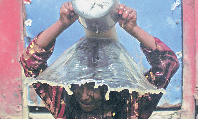 In this regard, an image of a woman in Hyderabad trying to beat the heat by pouring water over her is worth taking note of. The water that she is ostensibly using as a quick bathing technique is turbid, suggesting she’s scooping it out of the River Indus. The photographer, Nadeem Khawar, has very nicely captured the whole scene where the need to keep yourself clean and cool, and the method and means used for the purpose somehow cut a hard-to-classify picture.