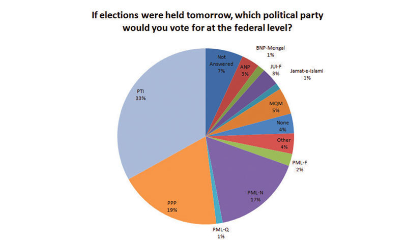 Reflective of this disillusionment and perhaps in line with the anti-incumbency sentiment exhibited during the previous general election, respondents say they will vote differently were elections to be held tomorrow. Survey results indicate that the top three parties at the federal level, were elections to be held immediately, would be the Pakistan Tehrik-e-Insaf, the Pakistan People’s Party and the Pakistan Muslim League-Nawaz--in exactly this order.