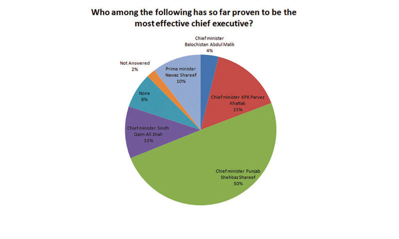 Almost 50pc of all respondents regard Chief Minister Punjab Shahbaz Sharif to have been the most effective chief executive in the past year, followed by Chief Minister Khyber Pakhtunkhwa Pervez Khattak (15.36pc) and Chief Minister Syed Qaim Ali Shah (11.15pc). Only 10.49pc of respondents regard Prime Minister Nawaz Sharif to have been the most effective chief executive in the past year.