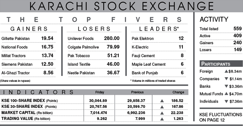 KARACHI: Spearheaded by the foreign institutional investors, the KSE-100 index crossed the psychological barrier of 30,000 points, again, on Friday, gaining 186.52 points (0.62 per cent) to settle at 30,044.89.