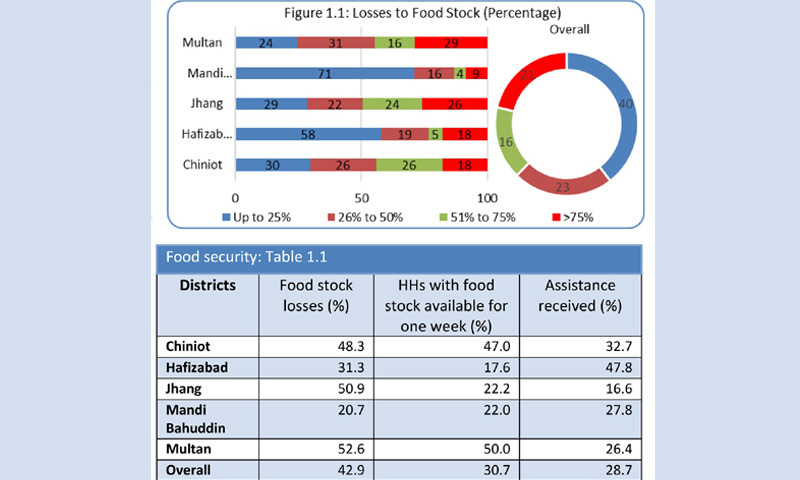 Specifically, around 21pc of the households were reported to be in more vulnerable condition, as they lost huge proportion (75pc) of their food stock. Reportedly, food stock losses were most serious in Districts Jhang, Multan and Chiniot where households lost about 50pc of their food stocks.