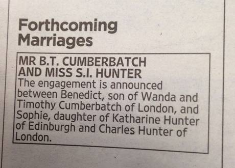 “The engagement is announced between Benedict, son of Wanda and Timothy Cumberbatch of London, and Sophie, daughter of Katharine Hunter of Edinburgh and Charles Hunter of London,” read the classified.