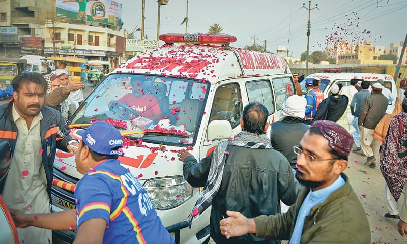 Family members and friends of the two LJ men — Attaullah, alias Qasim, and Mohammad Azam, alias Sharif — received their bodies outside the prison. They chanted slogans and showered rose petals on the ambulances when they emerged from the penitentiary.