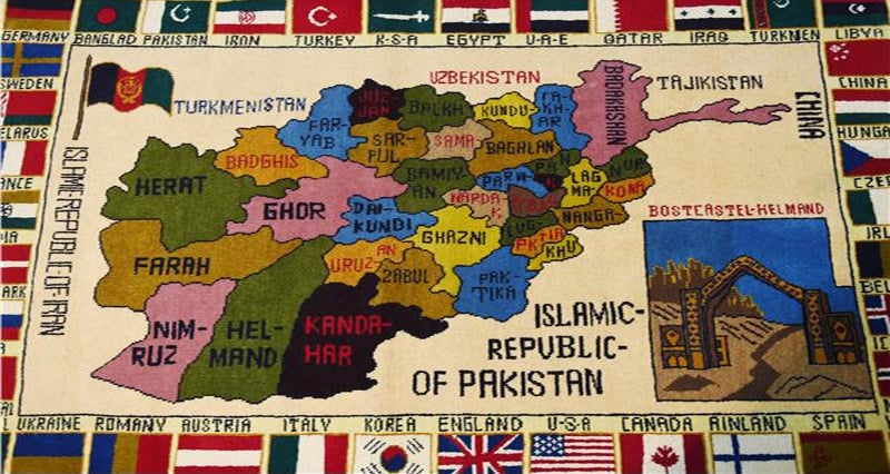 A carpet showing the map of Afghanistan with US fighter planes around it and the words “terrorism”, “Pakistan”, “China”, “USA” and “Britain” costs between $30 and $300 depending on its quality.