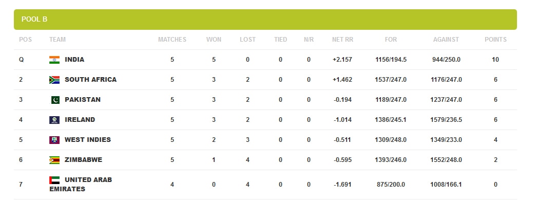 Currently, only India has qualified for the knock-out stages from Pool B, while South Africa is also in the box seat to advance. Ireland, Pakistan and West Indies are looking set to battle for the final two spots.