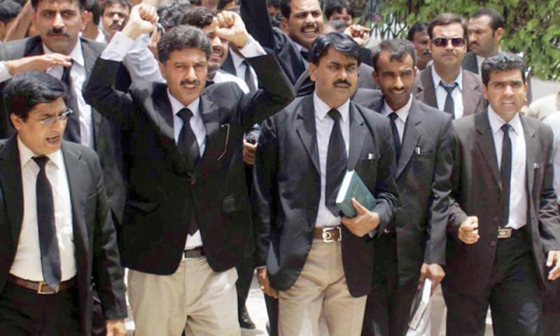The lawyers also staged a sit-in on M.A. Jinnah Road where their leaders including presidents of the SHCBA and the Karachi Bar Association spoke.