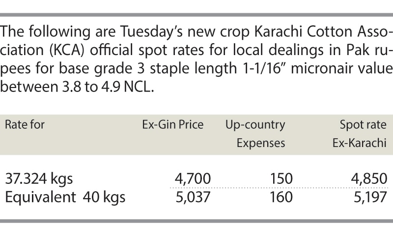 The Karachi Cotton Association (KCA) kept its spot rate unchanged at Rs4,850.