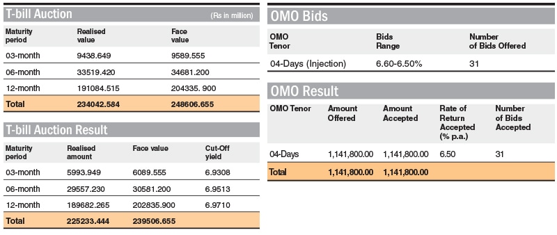 Of the total, 12-month T-bills fetched Rs189.682bn at a cut-off yield of 6.9710pc, followed by six-month T-bills with Rs29.557bn at 6.9513pc and three-month T-bills with Rs5.994bn at 6.9308pc.