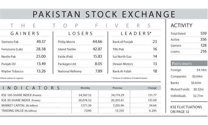 The index fell 151.77 points (0.44 per cent) on Monday to settle at 34,567.52. Stocks in oil and banking sectors succumbed to selling pressure.