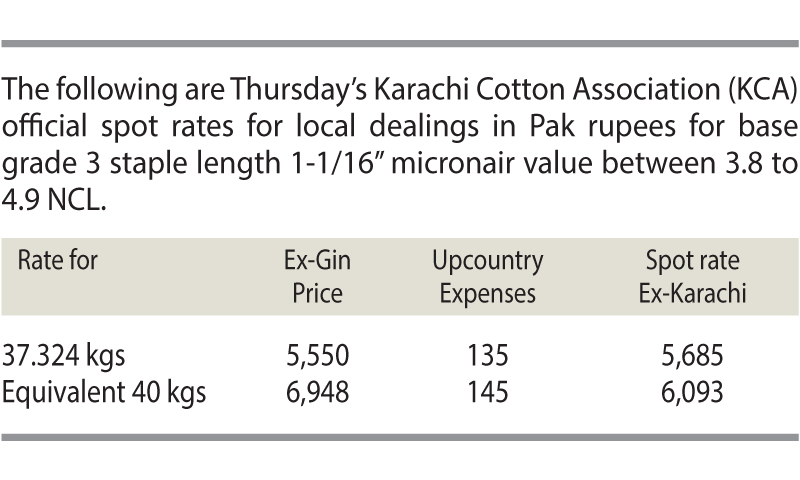 The Karachi Cotton Association’s spot rates were unchanged. Major deals on the ready counter were: 200 bales from Rohri (low quality) (Rs4,200), 400 bales Sher Sultan (Rs5,200), 100 bales Chichawatni (Rs5,300) and 400 bales Fazilpur (Rs5,800) (conditional).
