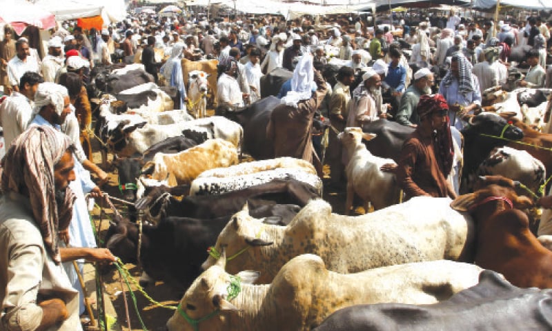 Some of the bulls at the markets, costing up to Rs0.5 million, await customers. The rates of goats, rams and sheep of reasonable size are about Rs25,000 to Rs30,000 per animal.