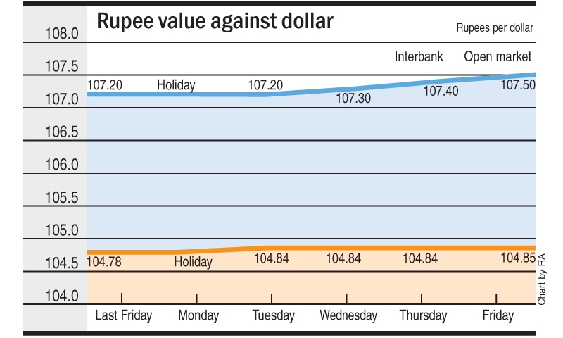 In the last trading session, the rupee inched down by one-paisa before closing the week against the dollar at Rs104.85 and Rs104.86.