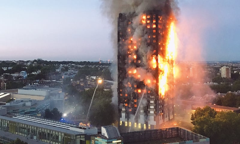 LONDON: At least 12 people died on Wednesday after a massive inferno tore through a London apartment block, with witnesses reporting that terrified residents had leapt from the building and dropped their children in a desperate bid for survival.