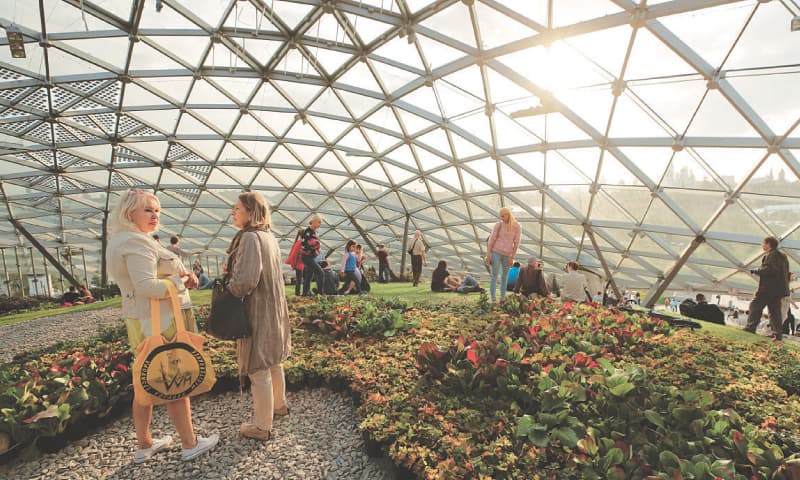 The park consists of a landscape with different geobotanical “zones” including one resembling a tundra, as well as attractions like a philharmonic hall concealed under a hill with a “glass crust” roof and an ice cave with a labyrinth.