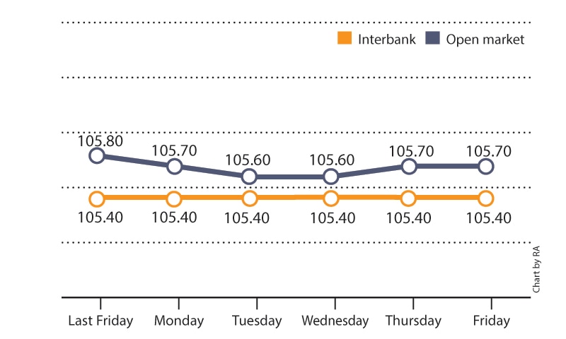Overall, the rupee on the interbank market opened the week flat at Rs105.40 and Rs105.41 and closed the week unchanged against the dollar at the same level.