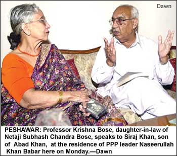 PESHAWAR, May 2: Professor Krishna Bose, daughter-in-law of the legendary Subhash Chandra Bose, met here on Monday the son of one of Netaji’s benefactors who had helped him in what later came to be known as the ‘Great Escape’. “I am very excited. Though I am here in Pakistan with a different agenda, but I decided to meet the family of Abad Khan and visit places where Netaji (Subhash) stayed,” said Prof Bose.