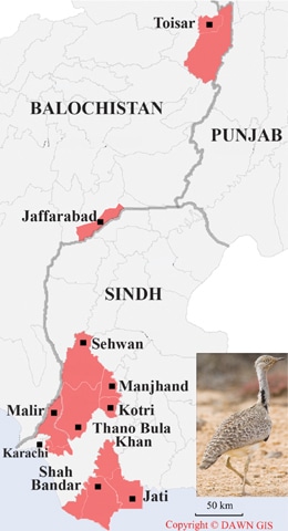 The letter says: “The ministry of foreign affairs of the Islamic Republic of Pakistan presents its compliments to the Embassy of the Kingdom of Bahrain in Islamabad and has the honour to state that the Government of Pakistan has conveyed its recommendation to the authorities in the concerned province for the allocation of following area to Sheikh Hamad bin Isa bin Salman Al-Khalifa, King of the Kingdom of Bahrain, for hunting houbara bustard in Tehsils Thano Bula Khan, Kotri, Manjhand and Sehwan of Jamshoro district for the season 2017-18.