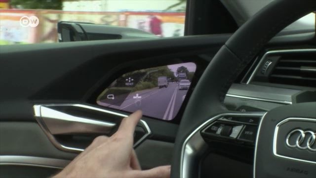 Audi’s engineers have integrated virtual mirrors, video image displays just above the door handles for the e-tron production model. It’s an Audi world premiere. They’re controlled much like a multimedia system.
