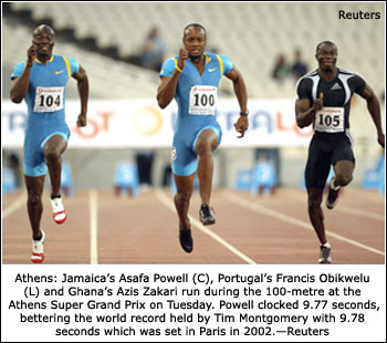 ATHENS, June 15: Jamaica’s Asafa Powell set a new 100 metres world record on Tuesday after clocking a time of 9.77 seconds at the Olympic Stadium (partly reported in Wednesday’s edition). On a warm summer’s night on one of the fastest tracks in the world, the 22-year-old beat Tim Montgomery’s previous record of 9.78 set in Paris in September 2002 to become the fastest man ever over the distance.