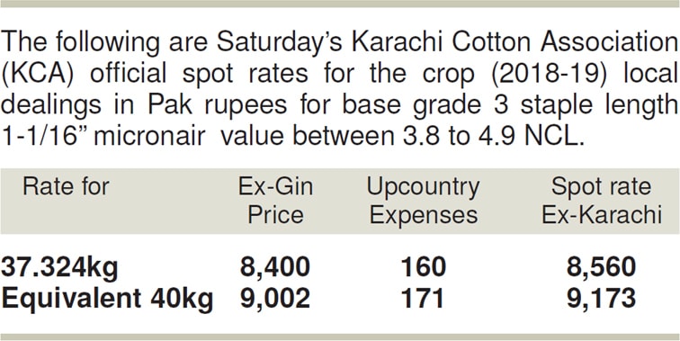 MULTAN: Cotton prices remained stable on Saturday as short supply of the commodity kept trading restricted. The Karachi Cotton Association also kept its spot rate unchanged at Rs8,400. Phutti (seed cotton) prices remained between Rs3,500-4,000.