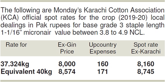 The Karachi Cotton Association (KCA) kept its spot rates at weekend level of Rs8,000 per maund.