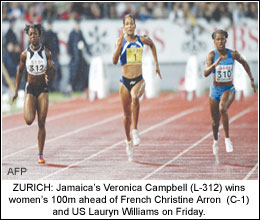 100 metres: 1. Veronica Campbell (Jamaica) 10.85 seconds; 2. Lauryn Williams (US) 10.88; 3. Chandra Sturrup (Bahamas) 10.97.