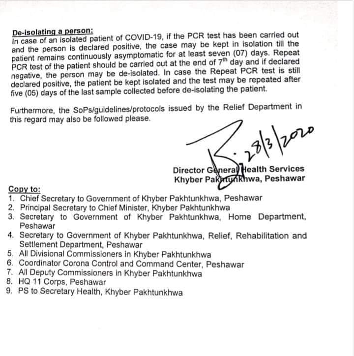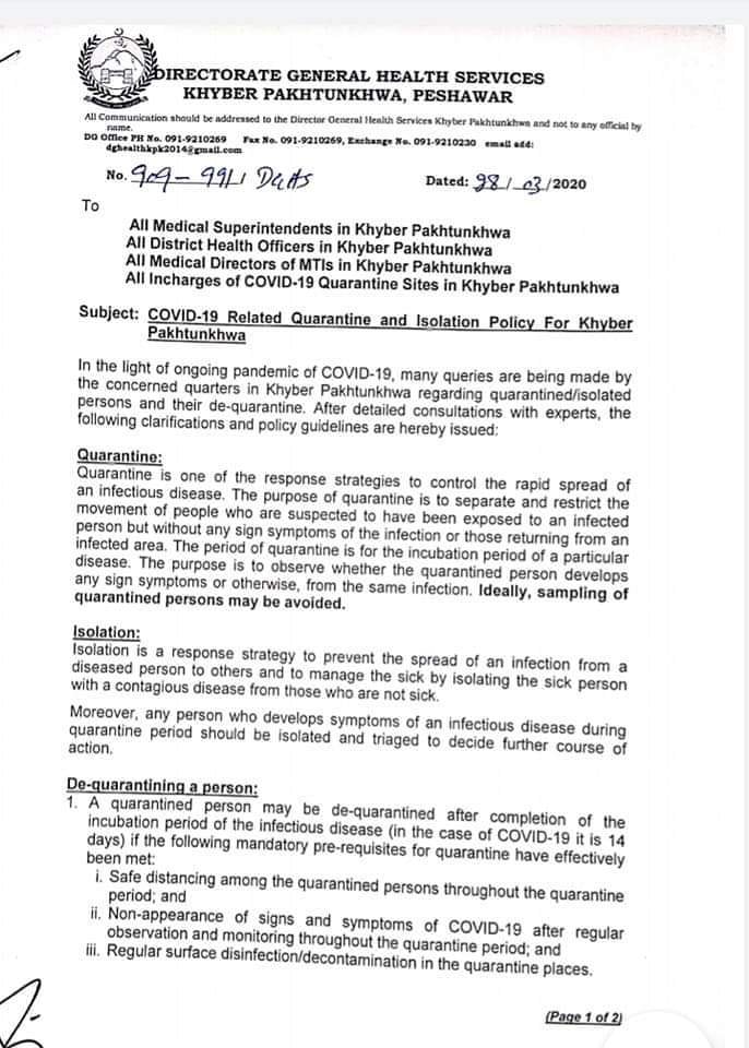 The Khyber Pakhtunkhwa health department has issued guidelines for quarantining and isolation of suspected coronavirus patients.