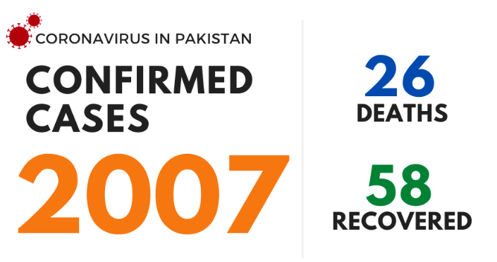 Pakistan now has 2,007 cases of the novel coronavirus, a month and a week after it reported its first infection of the disease.