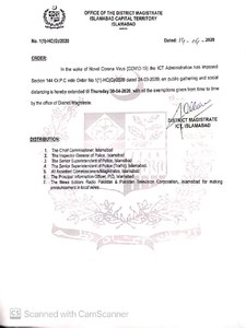 The Islamabad administration has extended Section 144 (an order to prohibit the assembly of four or more people in an area) of the Code of Criminal Procedure in the federal capital due to the coronavirus outbreak.