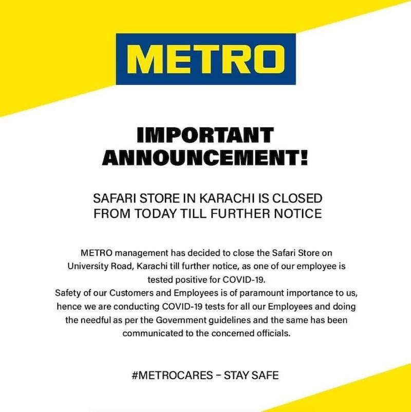 The management of Metro — a chain of cash carry superstores — has announced that they will temporarily close one of their stores, located on University Road in Karachi, after an employee tested positive for the novel coronavirus.