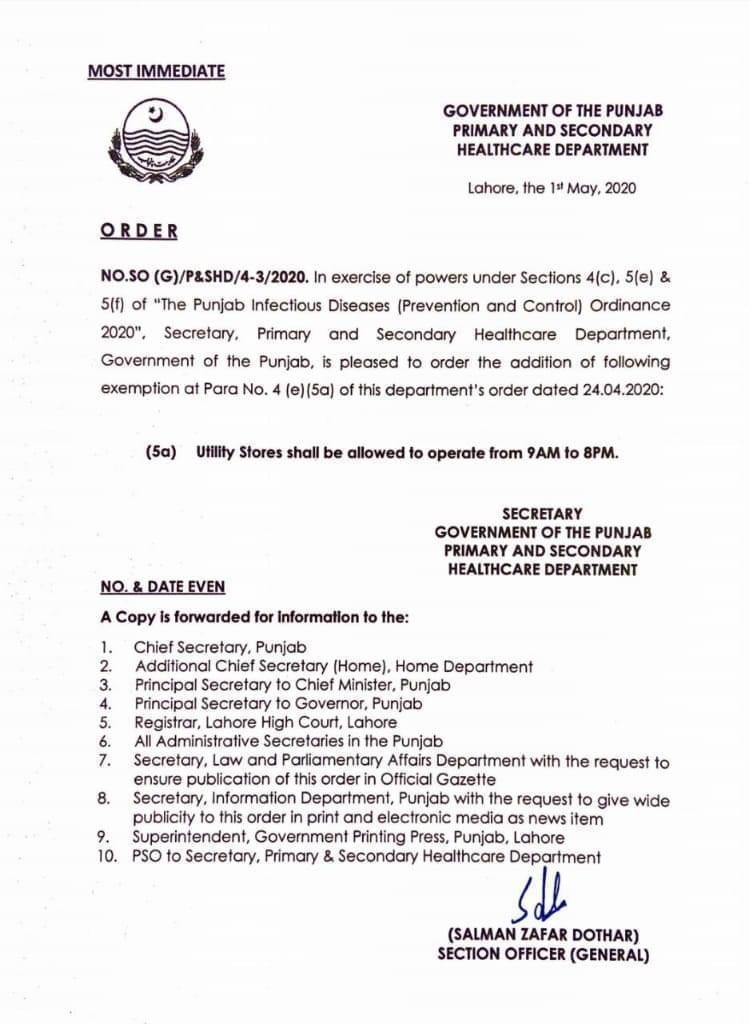 The Punjab government has issued a notification, increasing the time that utility stores in the province can remain open.
