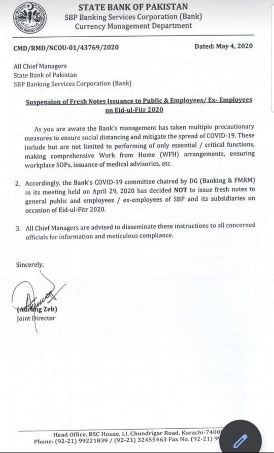 The State Bank of Pakistan has issued a statement saying it will not issue fresh banknotes for Eidul Fitr to the public and current as well as former employees in light of the coronavirus situation.