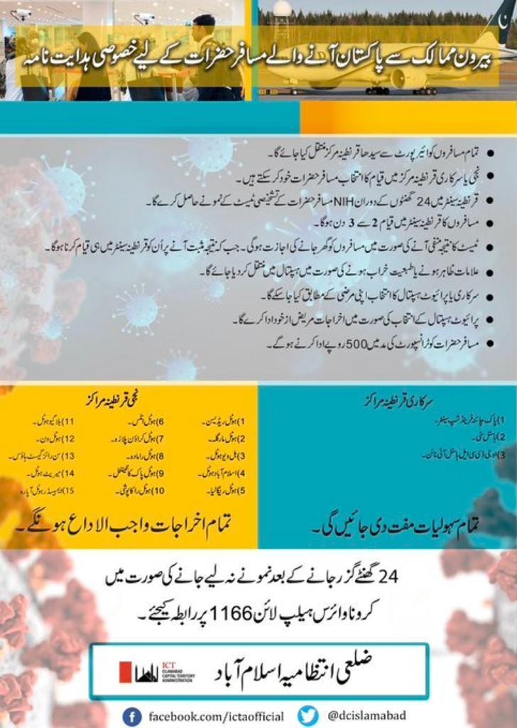 The Islamabad district administration has issued new standard operating procedures (SOPs) for citizens returning from abroad.