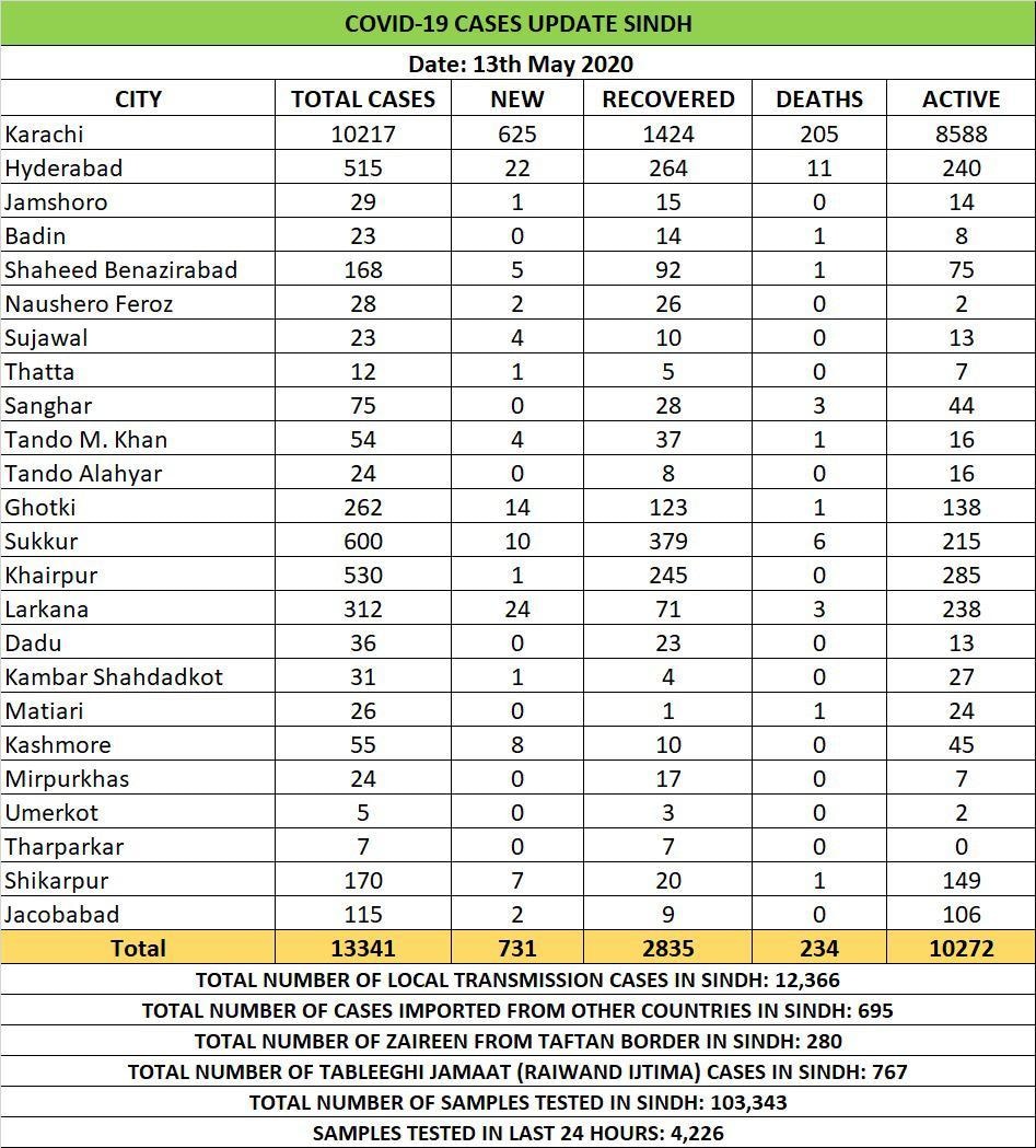 Out of the 731 infections reported in Sindh today, 625 were confirmed in Karachi.