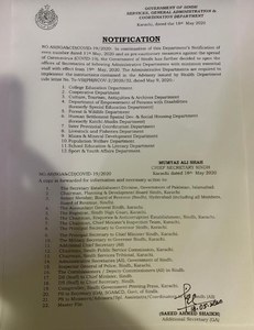The Sindh govt has issued a notification for opening the offices for the secretaries of 12 administrative departments "with minimum essential staff" with effect from May 19. These include the following departments;