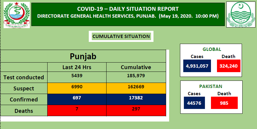Punjab has reported 697 new coronavirus cases, taking the provincial tally to 17,382, according to the daily situation report released by the province's Directorate of General Health.