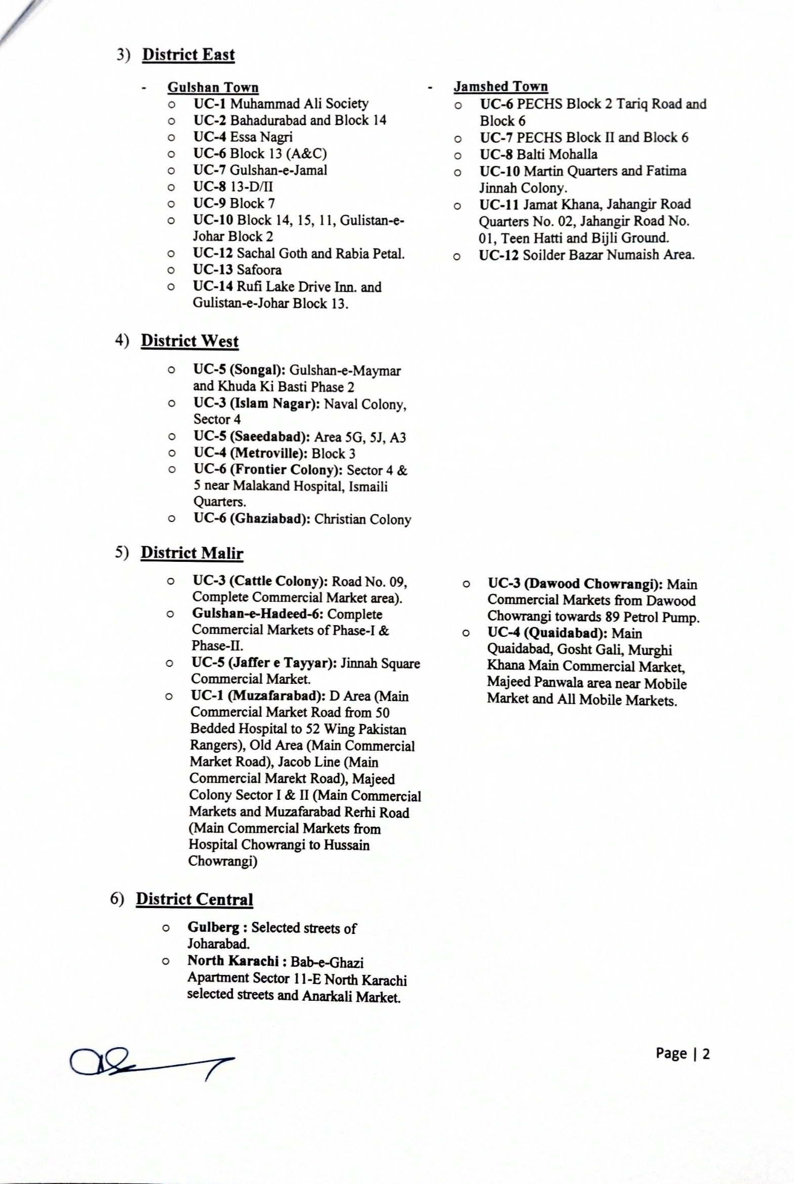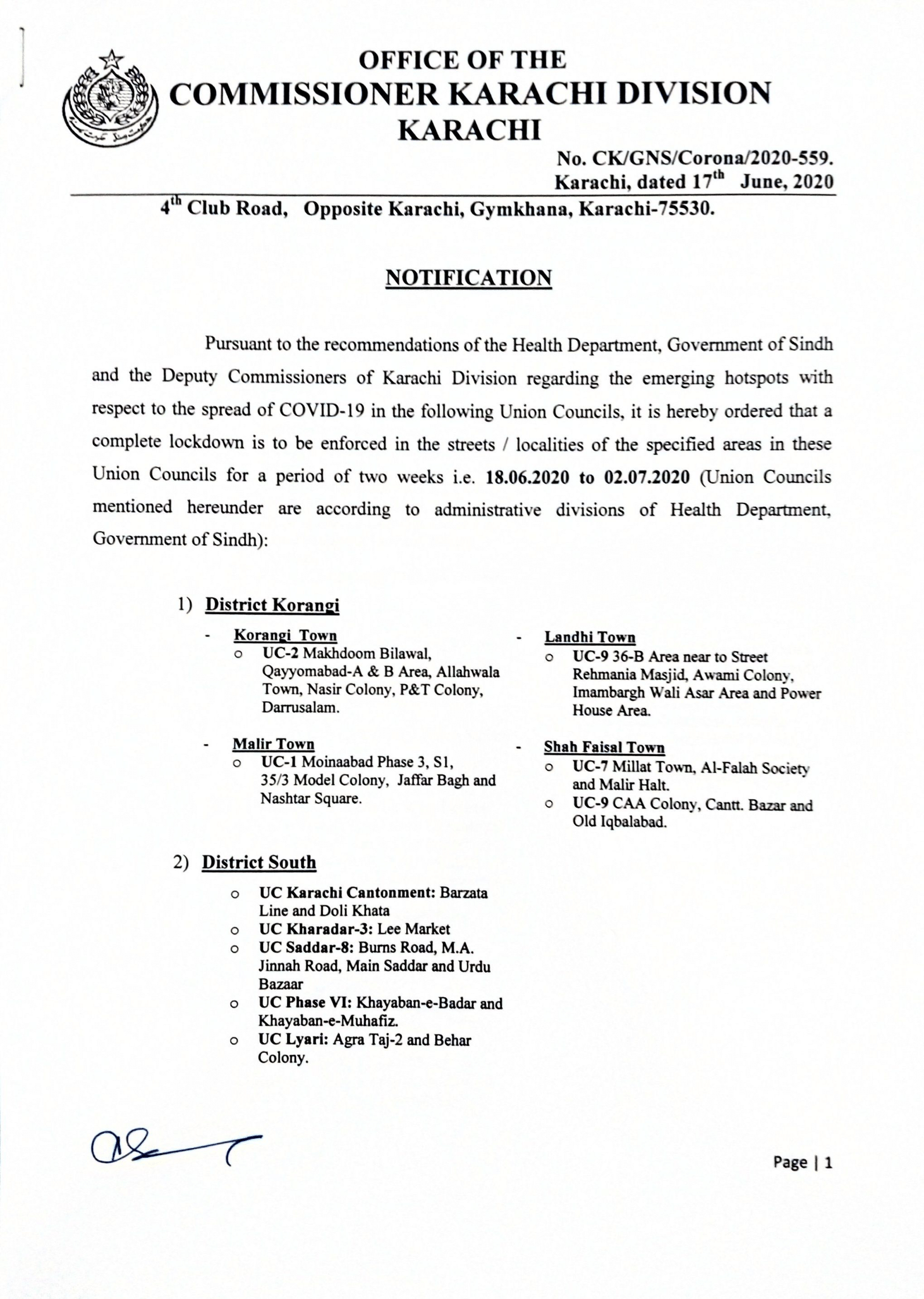 The Karachi Commissioner's Office has released a list of locations in all six union councils of the city that have been identified as coronavirus hotpsots and will be put under "complete lockdown" today.