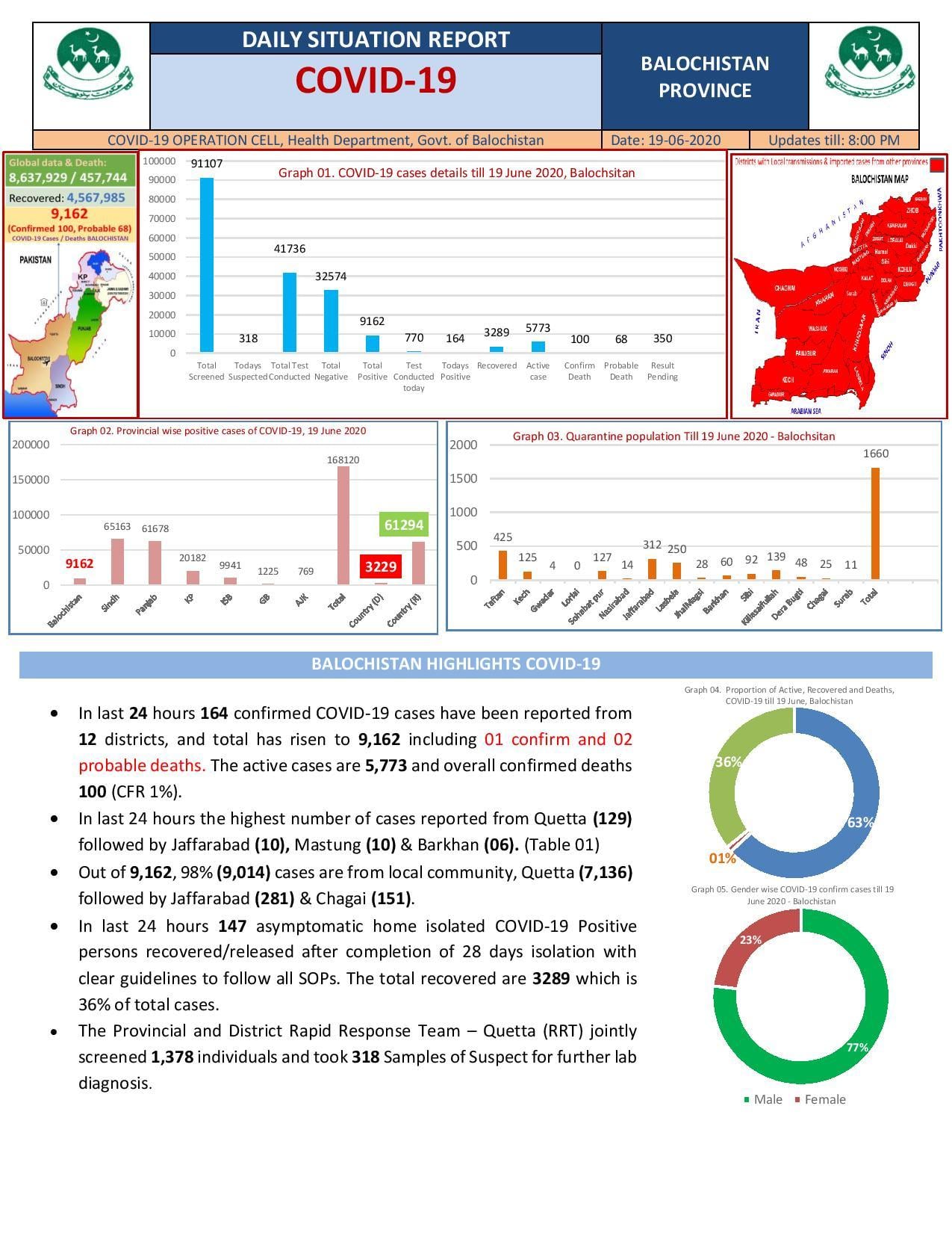 Balochistan has reported 164 coronavirus cases and one death during the past 24 hours, according to the provincial health department's daily situation report.