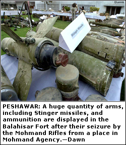 PESHAWAR, Sept 26: The paramilitary Frontier Corps has seized six US-made Stinger missiles and a huge cache of arms and ammunitions dumped in a compound in Mohammad Gath area of Mohmand Agency and arrested an accused.