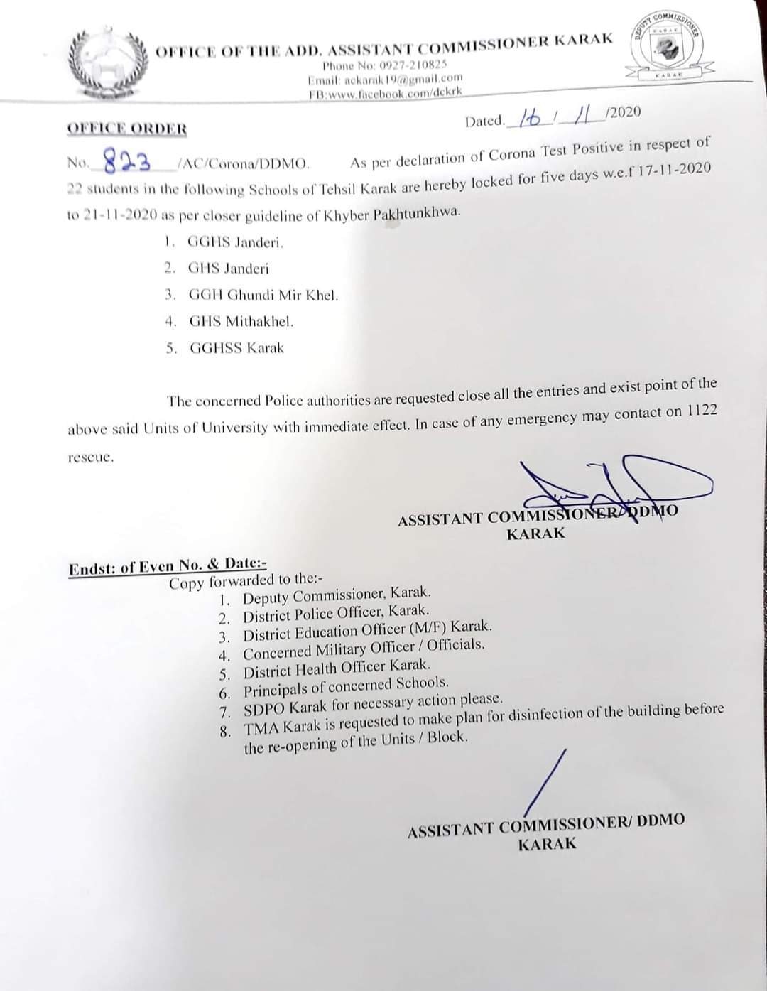 Five schools have been closed down in Khyber Pakhtunkhwa's Karak tehsil for five days after 22 students tested positive for the virus.
