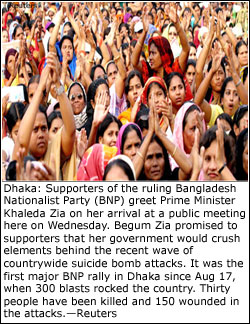 DHAKA, Dec 21: Bangladesh Prime Minister Khaleda Zia on Wednesday said the government had succeeded in forging a united front against militants and that those who had ‘stayed out of it’ were accomplices of the bombers.