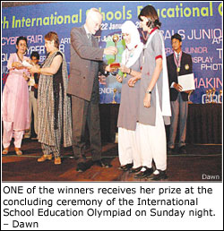 The City Naib Nazim, Nasreen Jalil, was the chief guest at the closing ceremony of the five-day Olympiad organized by the Karachi High School. The yearly Olympiad, which was held for the seventh time this year, was participated largely by students from private schools with English as their medium of instruction.