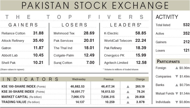 As a result, the KSE-100 index settled at 46,682.53 points, up 265.19 points or 0.57pc from the preceding session.