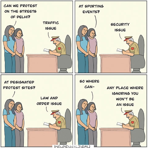 What the CAA was to Sheikh, the 2014 arrests of students for voicing anti-government opinions was to Rachita Taneja — who draws Sanitary Panels and has the unique distinction of fighting a contempt case against the Indian Supreme Court. Taneja refuses to comment on the case, but is adamant that scrutiny of the government is necessary.