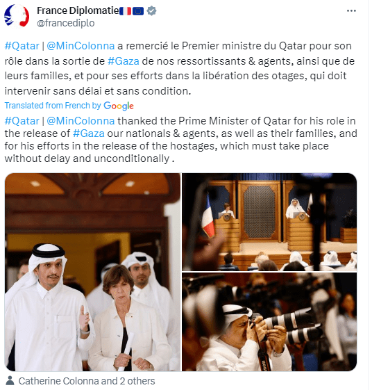 Colonna “will reiterate our condemnation of the terrorist actions of Hamas and the imperative of releasing the hostages,” the statement added, AFP reports.